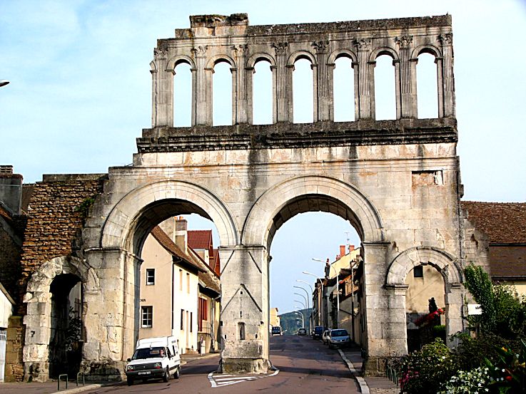 Zu Cäsars Zeit war Bibracte die Hauptstadt der Häduer. Unter Augustus wurden die Einwohner von Bibracte gezwungen, vom Berg hinunter an den Fuß des Berges umzusiedeln. Diese neue Stadt erhielt nach dem römischen Herrn den Namen "Augusto-dunum", d. h. "Augustus-Stadt", heute "Autun". Nach Ausweis des französischen Werbestempels geschah das im Jahre 15 v. Chr., im "Lexikon der Antike" findet sich das Jahr 12 v. Chr. In dieser Augustusgründung findet man heute noch deutliche Spuren der römischen Zeit, wie hier die Porte d'Arroux, die auf dem Stempel neben dem Umriss der Kathedrale erscheint. Mehr zu Autun: http://www.burgund-tourismus.com/patrimoine/autun.htm S. auch meine Seite! |