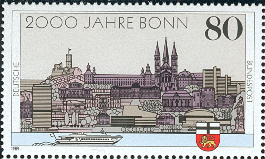 Katalogangabe (Michel): <Ausgabedatum> 12. Januar 1989; <Anlass> 2000 Jahre Bonn; <Bildinformation> Bedeutende Bauwerke in Bonn, Schiff, Stadtwappen Bonn informiert auf seiner offiziellen Homepage auch über die Römerzeit in Bonn. |