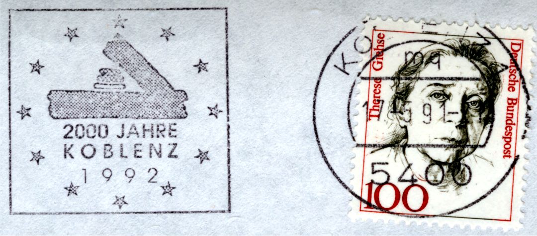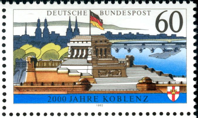 Katalogangabe (Michel): <Ausgabedatum> 9. Januar 1992; <Anlass> 2000 Jahre Koblenz; <Bildinformation> Sockel des Kaiser-Wilhelm-Denkmals, Stadtsilhouette mit Liebfrauen-und St.-Florinkirche, Balduinbrücke; Stadtwappen Auf seiner offiziellen Homepage informiert Koblenz folgendermaßen über seine Römerzeit (Anfang): Römische Zeit um 20 v. Chr. |