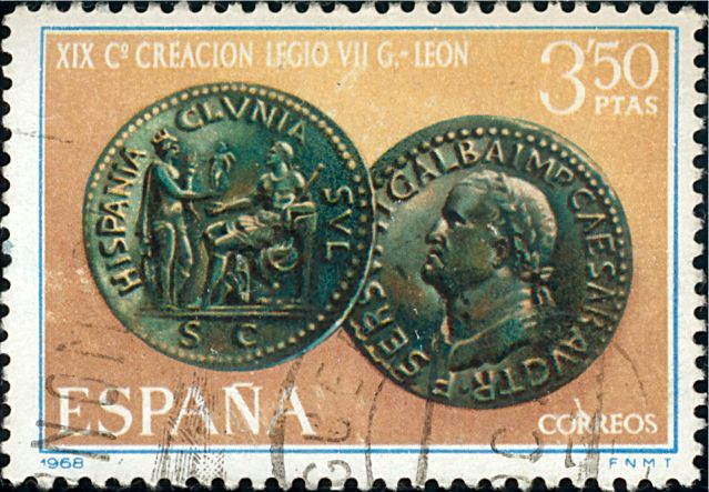 Katalogangabe (Michel): <Ausgabedatum> 15. Juni 1968; <Anlass> 1900 Jahre Stadt León; <Bildinformation> Römische Münze aus der Zeit 68-69 n. Chr. mit S. S. Galba, damals Imperator in Spanien