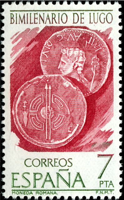 Katalogangabe (Michel): <Ausgabedatum> 22. September 1976; <Anlass> 2000 Jahre Stadt Lugo; <Bildinformation> Vorder- und Rückseite einer römischen Münze
