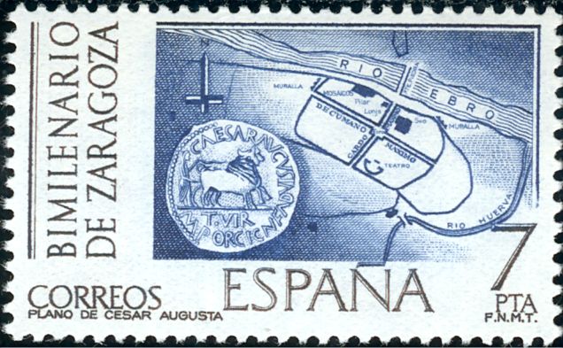 Katalogangabe (Michel): <Ausgabedatum> 26. Mai 1976; <Anlass> 2000 Jahre Saragossa (Caesaraugusta); <Bildinformation> Römischer Stadtplan, Münze