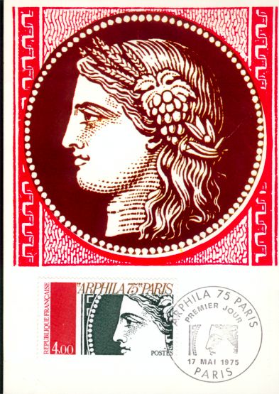 Katalogangabe (Michel): <Ausgabedatum> 17. Mai 1975; <Anlass> Internationale Briefmarken-Ausstellung ARPHILA '75, Paris; <Bildinformation> Ceres ((Detail der Marke von 1849) Wie man an dieser Maximumkarte erkennen kann, war das erste Motiv auf französischen Briefmarken der Kopf der Ceres. Das lässt sich eigentlich nur so verstehen, dass man vor 1849 den Reichtum des eigenen Landes vor allem in der Landwirtschaft sah. |