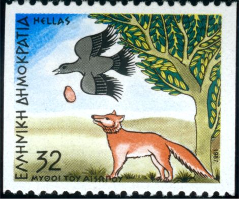 Katalogangabe (Michel): <Ausgabedatum> 5. März 1987; <Anlass> Die Fabeln Äsops; <Bildinformation> Der Rabe und der Fuchs Rabe und FuchsEin Rabe hatte einen Käse gestohlen, flog damit auf einen Baum und wollte dort seine Beute in Ruhe verzehren. Da es aber der Raben Art ist, beim Essen nicht schweigen zu können, hörte ein vorbeikommender Fuchs den Raben über dem Käse krächzen. Er lief eilig hinzu und begann den Raben zu loben: »O Rabe, was bist du für ein wunderbarer Vogel! Wenn dein Gesang ebenso schön ist wie dein Gefieder, dann sollte man dich zum König aller Vögel krönen!« Dem Raben taten diese Schmeicheleien so wohl, daß er seinen Schnabel weit aufsperrte, um dem Fuchs etwas vorzusingen. Dabei entfiel ihm der Käse. Den nahm der Fuchs behend, fraß ihn und lachte über den törichten Raben. |