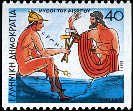 Katalogangabe (Michel): <Ausgabedatum> 5. März 1987; <Anlass> Die Fabeln Äsops; <Bildinformation> Der Holzfäller und Hermes Der Holzfäller und HermesEinem Holzfäller fiel die Axt in einen Fluss. Als aber die Strömung
