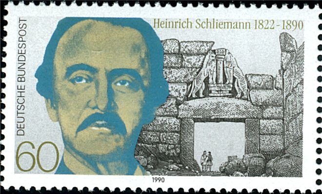 Katalogangabe (Michel): <Ausgabedatum> 11. Oktober 1990; <Anlass> 100. Todestag von Heinrich Schliemann <Bildinformation> H. Schliemann (1822 - 1890), Altertumsforscher; Löwentor von Mykene