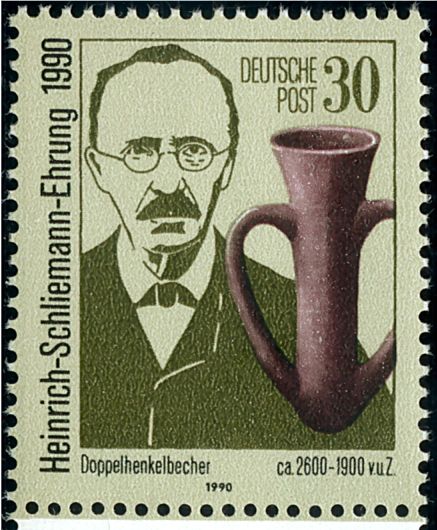 Letzte Markenausgabe der DDR! Katalogangabe (Michel): <Ausgabedatum> 2. Oktober 1990; <Anlass> 100. Todestag von Heinrich Schliemann <Bildinformation> Doppelhenkelbecher (Troja) (ca. 2600 bis 1900 v. Chr.)