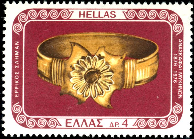Katalogangabe (Michel): <Ausgabedatum> 8. Dezember1976; <Anlass> Heinrich Schliemann <Bildinformation> Funde aus den königlichen Schachtgräbern der Akropolis von Mykene: Goldenes Armband