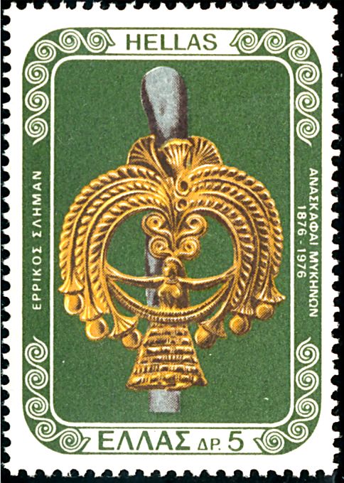 Katalogangabe (Michel): <Ausgabedatum> 8. Dezember1976; <Anlass> Heinrich Schliemann <Bildinformation> Funde aus den königlichen Schachtgräbern der Akropolis von Mykene: Göttin darstellende Brosche
