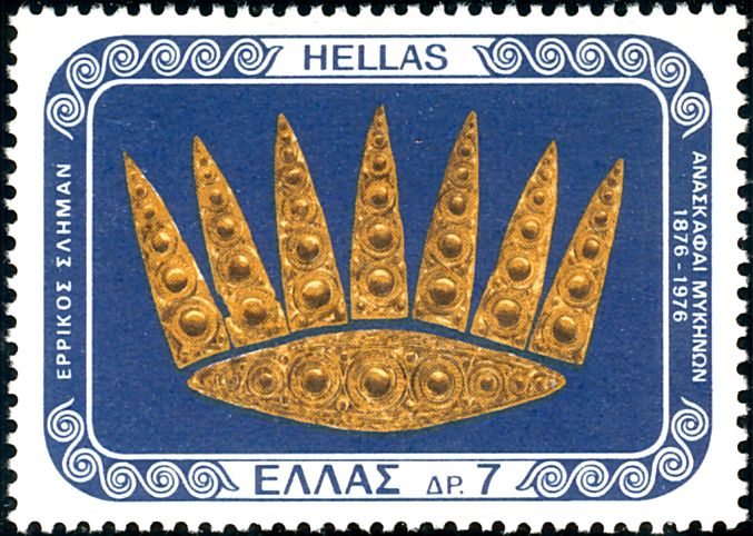 Katalogangabe (Michel): <Ausgabedatum> 8. Dezember1976; <Anlass> Heinrich Schliemann <Bildinformation> Funde aus den königlichen Schachtgräbern der Akropolis von Mykene: Goldenes Kopfdiadem