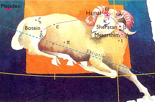 Hamal ("Lamm"), Sheratan und Mesarthim; "Sheratan" sei