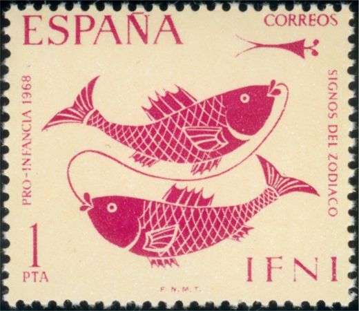 Katalogangabe (Michel): <Ausgabedatum> 25. April 1968; <Anlass> Kinderhilfe: Tierkreiszeichen <Bildinformation> Fische