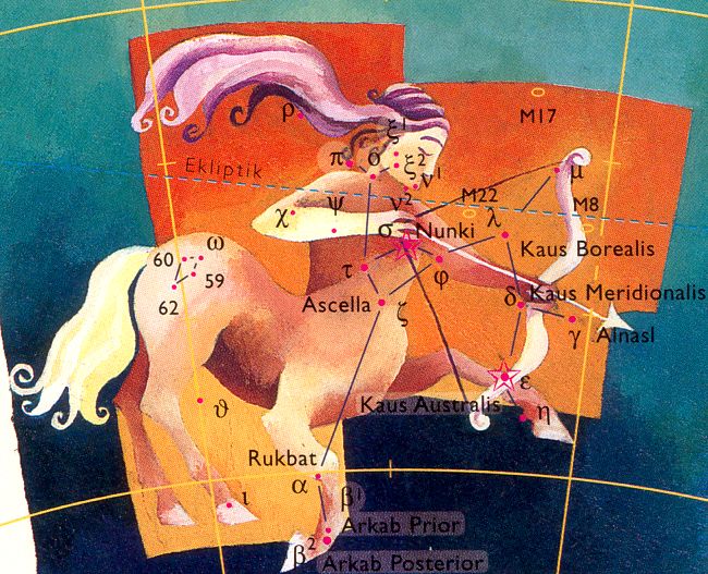 In der Kartensicht schießt der Schütze nach Westen, also nach rechts. Die Schweizer Marke dreht also auch hier wie beim Löwen das Motiv aus graphischen Gründen - oder es handelt sich hier wie dort um die Globussicht. - Zum Mythos schreibt Cornelius: " Die Griechen sahen in Sagittarius den Satyr Krotos (teils Mensch, teils Ziege, ausgestattet mit einem langen Pferdeschwanz), der oft auf zwei Beinen dargestellt wurde. Bei den Römern handelte es sich um den weisen Zentaur Chiron, was häufig zu Verwechslungen mit dem Sternbild Zentaur am südlichen Himmel führt. Doch sind die beiden Wesen völlig verschieden: Der Schütze ist ein Jäger, der auf Nergal, den mesopotamischen Schützengott, zurückgeht. Er wurde mit der rachsüchtigen Kriegs- und Feuergöttin Irra in Verbindung gebracht (griechisch: Ares, römisch: Mars)." - In seinem Einführungstext hatte Cornelius den Schützen als Kentauren erklärt, der mit seinem Pfeil auf den Skorpion schießt.
