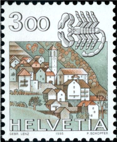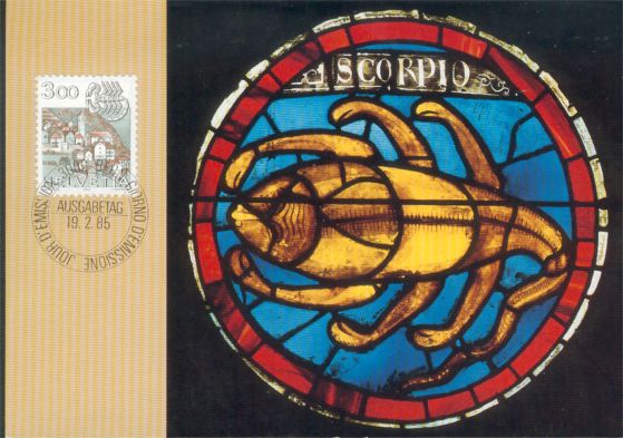 Katalogangabe (Michel): <Ausgabedatum> 19. Februar 1985; <Anlass> Freimarken: Tierkreiszeichen und Landschaften; <Bildinformation> Skorpion; Corippo