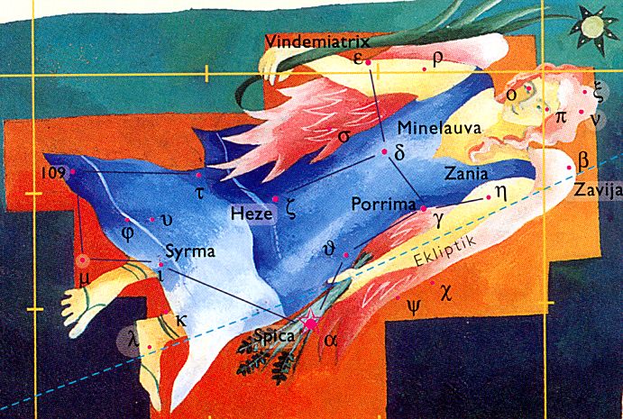 Gut zu sehen von der Jungfrau - so Cornelius - sei ihr Hauptstern Spica, die "Kornähre" in ihrer linken Hand. Zur Mythologie schreibt er: "Bereits in der assyrisch-babylonischen Kultur wurde die Jungfrau so beschrieben wie heute. Das Sternbild galt immer als weiblich und wurde mit dem Spannungsverhältnis zwischen Fruchtbarkeit und Reinheit assoziiert - Elemente, die in ihren Legenden verschmelzen. Die Babylonier verbanden sie mit der Göttin Ischtar (auch Aschtoreth oder Astarte)."