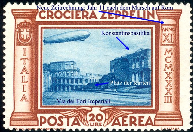 Aerea 9 Lire. Dass die Anlage der Via dei Fori Imperiali für die damals aktuelle Ideologie wichtig war, zeigt auch der Höchstwert der Zeppelin-Marke von 1933: |