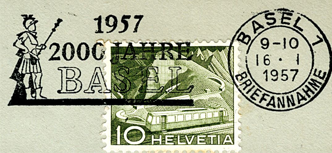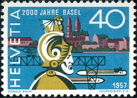 Katalogangabe (Michel): <Ausgabedatum> 27. Februar 1957; <Anlass> Jahresereignisse: 2000 Jahre Basel; <Bildinformation> Munatius Plancus, Gründer der Stadt Basel, vor Münster mit Pfalz und Darstellung der Rheinschiffahrt Auf