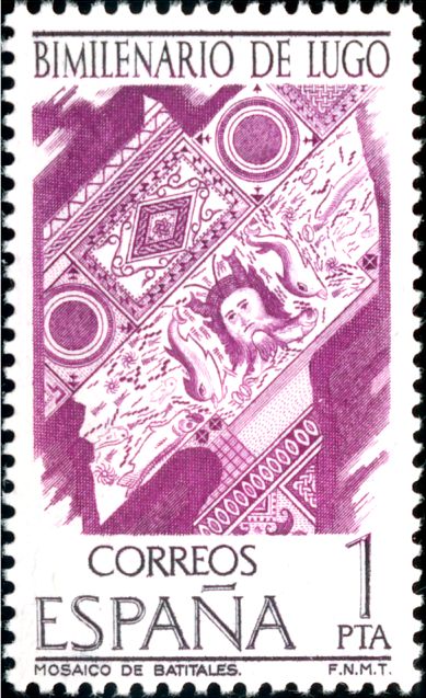 Katalogangabe (Michel): <Ausgabedatum> 22. September 1976; <Anlass> 2000 Jahre Stadt Lugo; <Bildinformation> Fragment des Mosaikfundes bei Batitales Lugo informiert auf seiner Homepage über die römischen Spuren: http://www.concellodelugo.org/turismo/turismo.asp?s=70&s1=72&s2=Vestixios%20Romanos Für den Antikenfan ist folgende Seite von Lugo noch
