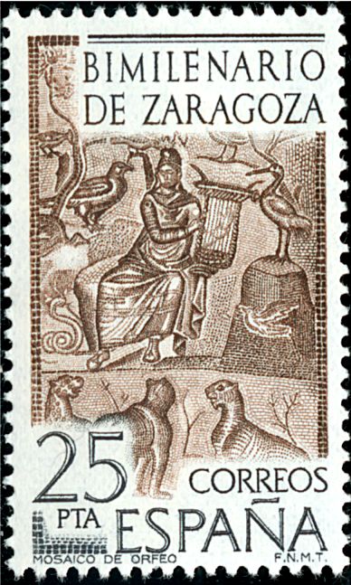 Katalogangabe (Michel): <Ausgabedatum> 26. Mai 1976; <Anlass> 2000 Jahre Saragossa (Caesaraugusta); <Bildinformation> Orpheus-Mosaik