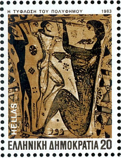 HOMEROS (8. Jahrhundert v. Chr.) Katalogangabe (Michel): <Ausgabedatum> 19. Dezember 1983; <Anlass> Freimarken: Die epischen Dichtungen Homers; <Bildinformation> Odysseus blendet Polyphem Bei diesem Markenbild handelt es sich um ein Detail mit der Blendung Polyphems durch Odysseus von einer protoattischen Amphora (um 680 v. Chr.) aus dem Museum von Eleusis. (s. Bernard Andreae, ODYSSEUS. Mythos und Erinnerung, Mainz, von Zabern, 1999; S. 110f.) |
