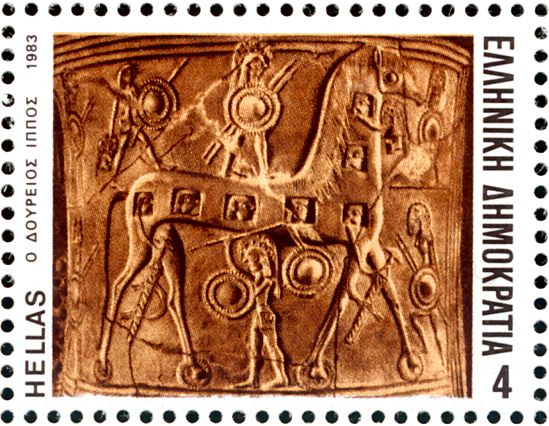 HOMEROS (8. Jahrhundert v. Chr.) Katalogangabe (Michel): <Ausgabedatum> 19. Dezember 1983; <Anlass> Freimarken: Die epischen Dichtungen Homers; <Bildinformation> Das Trojanische Pferd Diese Darstellung des Trojanischen Pferdes stammt aus einer