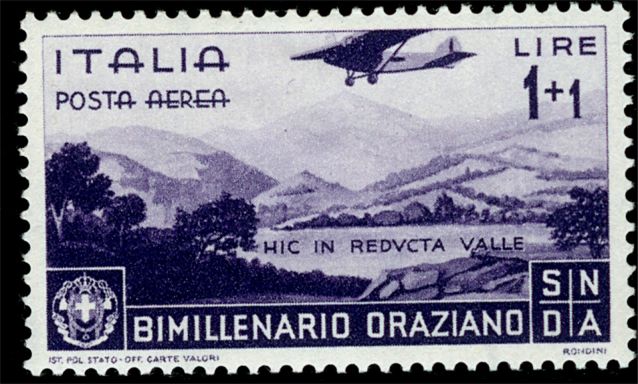 Auch hier stellt die Michel-Katalog-Information vor allem das Flugzeug vor: "Flugzeug Caproni 101 über Gebirgssee". - In seiner Ode I 17 lässt Horaz im Hirtenmilieu das Land preisen, dabei heißt es in den Versen 17-20, zitiert ist ein Teil von Vers 17: