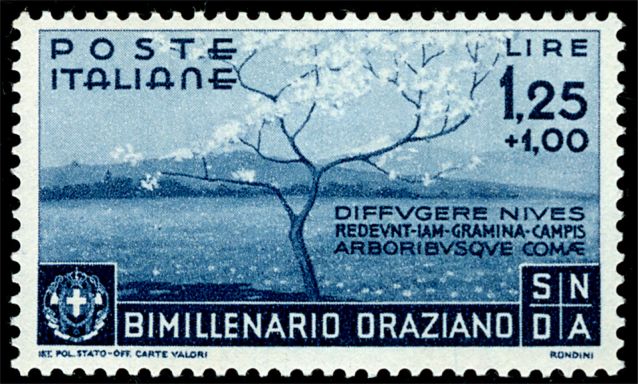 Ein blühendes Bäumchen in der Landschaft (beim Ätna?), dazu ein Zitat aus der Ode IV 7 des Horaz (Verse 1-4, zitiert 1f.). Das Zitat ist nicht repräsentativ fürs gesamte Gedicht, in dem Horaz sehr pessimistisch das Carpe-Diem-Motiv variiert, sondern scheint aus einem unbeschwerten Frühlingsgedicht zu stammen.