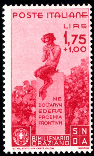 Ein Pan, seine Flöte spielend, sitzt auf einem modernen Gedenkstein, der seinerseits wieder zwischen Reben steht. Der Gedenkstein trägt eine Inschrift, die aus der ersten Ode des Horaz (Carmen I 1, 29-36, zitiert 29) stammt:
