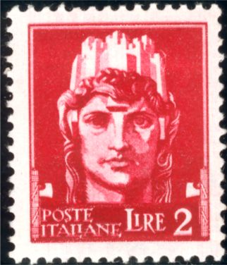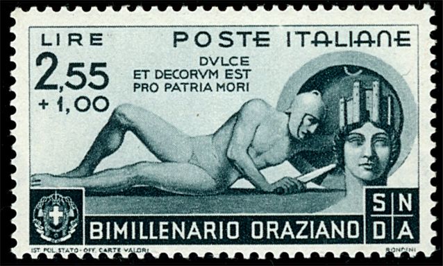 Vom Gesamttext der Strophe ergibt sich ja eher der Sinn: Wenn schon gestorben werden muss, dann ist es nicht unrühmlich, für ein Ziel, nämlich in diesem Fall das Vaterland, gestorben zu sein. Aber der andere Sinn wird im Bild illustriert: Der Laomedon aus dem Ostgiebel des Aphaia-Tempels von Ägina wird durch den anderen Helm etwas romanisiert, sein Blick richtet sich auf die Büste der "Italia turrita", der turmgekrönten Italia, die die "patria" der Horaz-Stelle verdeutlicht; diese Italia ist von den Dauermarken der Mussolini-Zeit, aber besonders von denen der frühen Nachkriegszeit bestens bekannt.