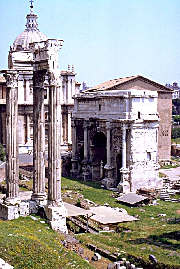 Rom - der Gipfel der Welt: Seltsamerweise wird hier kein bestimmtes Bild, sondern eine Montage mancher Sehenswürdigkeiten gezeigt, auffallend, dass es sich vor allem um Bauten der Flavierzeit (Kolosseum, Vespasianstempel, Titusbogen) handelt: