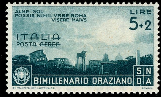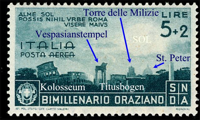 Auf dem Höchstwert wird mit einem Zitat aus dem Carmen Saeculare Rom gepriesen. Das Zitat wird noch einmal verwendet auf der Luftpostmarke der Augustusserie zu 80 Centesimi.: