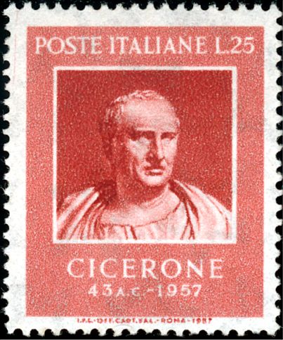 M. TULLIUS CICERO (106 - 43 v. Chr.) Katalogangabe (Michel): <Ausgabedatum> 30. November 1957; <Anlass> 2000. Todestag von Marcus Tullius Cicero; <Bildinformation> Cicero (106-43 v. Chr.), Redner und Schriftsteller Cicero, M. Tullius, geb. 106 Arpinum (Samnium), ermordet 43 v. u. Z. bei Formiae,
