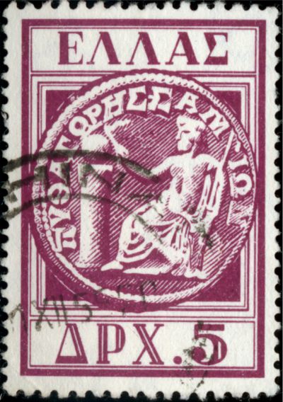 PYTHAGORAS VON SAMOS (um 540 - 500) Katalogangabe (Michel): <Ausgabedatum> 20. August 1955; <Anlass> Pythagoreer Kongress; <Bildinformation> Antike Münze aus Samos mit Bild des Pythagoras Pythagoras, lat. Pythagoras,