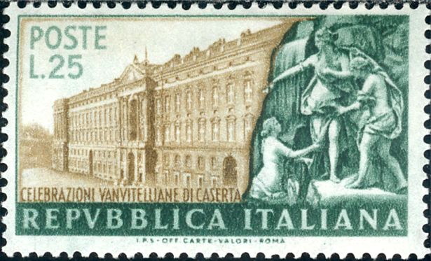 Katalogangabe (Michel): <Ausgabedatum> 1. Februar 1952; <Anlass> Jahrestag der Grundsteinlegung zum Schloss Caserta; <Bildinformation> Kgl. Schloss Caserta bei Neapel, rechts "Apollo mit den Nymphen" im Schlosspark Über Vanvitelli und Caserta informiert Wikipedia kurz: "Begonnen wurde der Bau des Palastes im Jahre 1752 durch den berühmten in Neapel geborenen römischen Architekten Luigi Vanvitelli nach dem Vorbild von Schloss Versailles. Es handelt sich um eine der meistbesuchten Sehenswürdigkeiten Italiens mit reichverzierten Sälen und einem einzigartigen Schlosspark, der eine der größten Grünflächen Campaniens darstellt und zum Besten gehört, was das 18. Jahrhundert auf dem Gebiet der Gartenkunst hervorgebracht hat." Der Ausschnitt der Plastikengruppe wurde wohl so gewählt, dass man zwar Nymphen, aber keinen Apoll erkennt. |