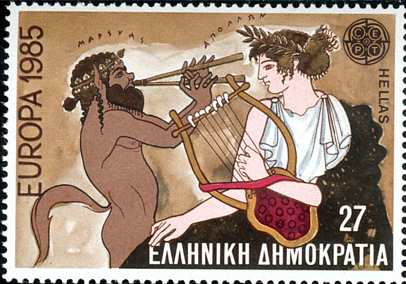 Katalogangabe (Michel): <Ausgabedatum> 29. April 1985; <Anlass> Europa: Europäisches Jahr der Musik; <Bildinformation> Musikwettstreit zwischen dem Gott Apollo und dem phrygischen Satyr Marsyas Marsyas, in der griechischen Sage phrygischer Satyr oder Silen, hob die Flöte auf, die Athena weggeworfen hatte, weil das Blasen ihr Gesicht entstellte, und gelangte zu großer Meisterschaft im Spiel. Apollon, von