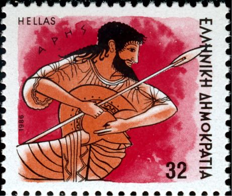 Katalogangabe (Michel): <Ausgabedatum> 17. Februar 1986; <Anlass> Freimarken: Die Götter des Olymp; <Bildinformation> Ares Ares, griechischer Kriegsgott, Sohn des Zeus und der Hera; als wilder Gott des zerstörenden, leidvollen Krieges wenig beliebt, war er sogar den Göttern verhaßt (im Unterschied zu dem röm. Mars, dem Vater des Romulus und Remus, dem er später gleichgesetzt wurde). Er war der Geliebte der Aphrodite; beider Sohn ist Eros.