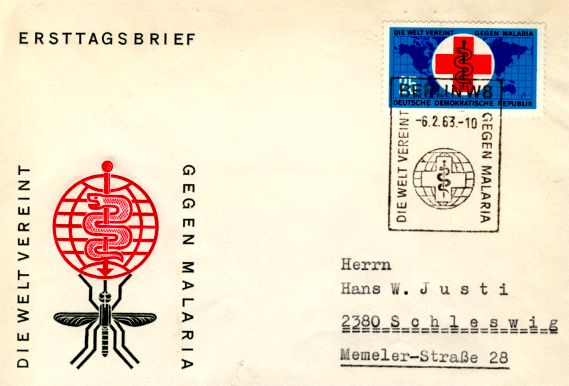 ASKLEPIOS - AESCULAPIUS Katalogangabe (Michel): <Ausgabedatum> 6. Februar 1963; <Anlass> Kampf gegen die Malaria; <Bildinformation> Rotes Kreuz mit Äskulapstab Dreimal, auf Marke, Stempel und Zudruck, erscheint die Schlange, die sich um den Stab windet, als Zeichen des Asklepios. |