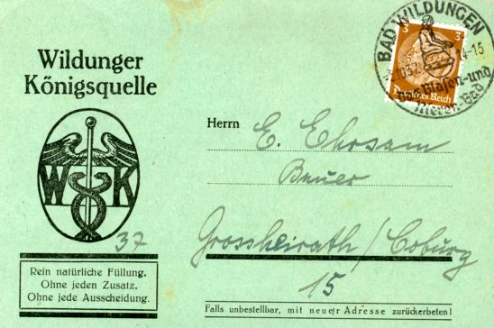 ASKLEPIOS - AESCULAPIUS Das Emblem der Wildunger Königsquelle zeigt den Äskulapstab, wobei durch die Flügel auch noch Hermes in den Blick gerät; man will sich also nicht nur als heilungsfördernd, sondern auch als wirtschaftskräftig darstellen. |