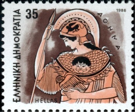 Katalogangabe (Michel): <Ausgabedatum> 17. Februar 1986; <Anlass> Freimarken: Die Götter des Olymp; <Bildinformation> Athene Auf dieser Darstellung sind die Attribute der Athene gut erkennbar: sie ist eine gerüstete Frau, trägt also Helm (mit Darstellung einer Sphinx) und Lanze. Über ihrer Brust trägt sie die Ägis (der Name bedeutet eigentlich "Ziegenfell") mit dem Medusenhaupt, in ihrer Linken hält sie ihren heiligen Vogel, die Eule. |