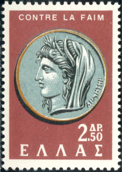 Katalogangabe (Michel): <Ausgabedatum> 25. April 1963; <Anlass> Kampf gegen den Hunger; <Bildinformation> 10-Silber-Drachmen (1930): Kopf der Göttin der Fruchtbarkeit, Demeter So lautet auch die Beschriftung auf dem Münzbild; die strukturelle Gemeinsamkeit zur französischen Briefmarke, auch wenn sie offiziell als "Marianne" bezeichnet wird, ist deutlich. |