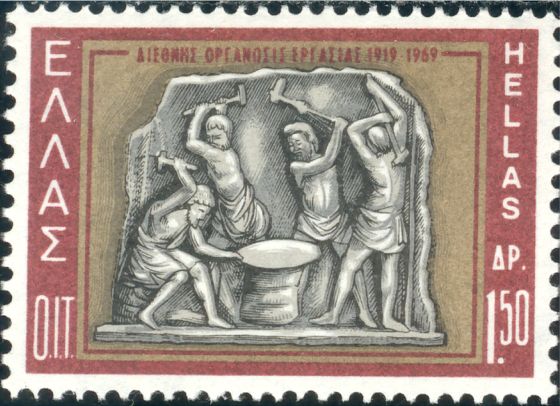 Katalogangabe (Michel): <Ausgabedatum> 10. Februar 1969; <Anlass> 50 Jahre Internationale Arbeitsorganisation (IAO); <Bildinformation> Hephaistos, der Gott des Feuers und der Kunst, und Zyklopen am Amboss (Detail eines antiken Reliefs)