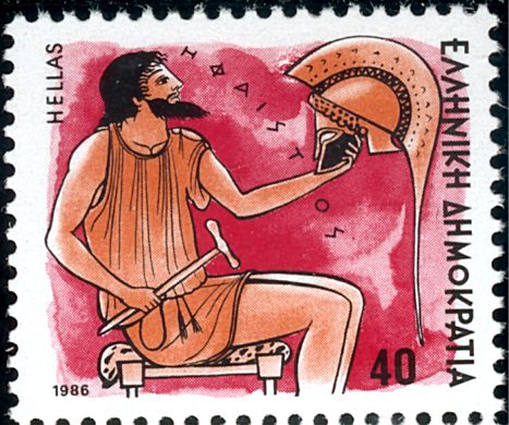 nichtgriechischer, aus Kleinasien (Karien, Lykien) stammender Gott; dort und bes. auf Lemnos galten ihm bei Erdfeuern Kulte. Er war der Sohn des Zeus und der Hera (oder Heras allein). Seine Füße waren verkrüppelt, entweder weil Zeus ihn, als er in einem Streit seiner Mutter gegen Zeus beistand, aus dem Olymp schleuderte und er auf Lemnos herunterstürzte, oder weil Hera ihn nach der Geburt, da er ein Krüppel war, aus dem Olymp warf. Als Meister der Schmiedekunst - er wird als der einzige antike Gott Griechenlands arbeitend in seiner Werkstatt dargestellt - verfertigte er mit seinen Gesellen, den Kyklopen, den Göttern Waffen und Schmuck, er bildete die Pandora. Als der kunstreichste Gott war