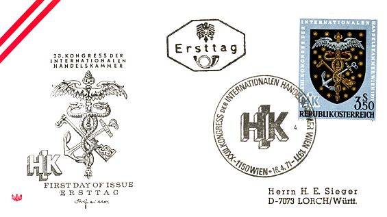 Katalogangabe (Michel): <Ausgabedatum> 16. April 1971; <Anlass> Kongress der Internationalen Handelskammer, Wien; <Bildinformation> Gremiumswappen der Großhändler (um 1900) Der Caduceus ist der Heroldsstab des Hermes/Merkur und damit die Grundlage des abgebildeten Emblems: der Stab mit den beiden Schlangen, die sich um ihn winden. |