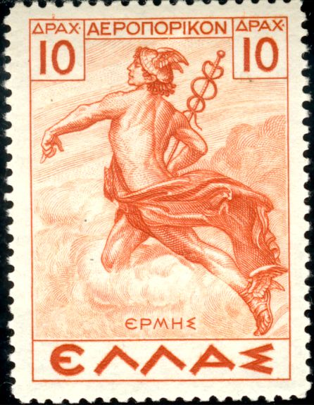 Katalogangabe (Michel): <Ausgabedatum> 10. November 1935; <Anlass> Flugpostmarken: Darstellungen aus der altgriechischen Sagenwelt; <Bildinformation> Götterbote Hermes Auf dieser Marke sind die Attribute von Hermes/Merkur sehr gut erkennbar: Flügelschuhe, Flügelhelm und in der Hand der Caduceus, sein schlangenumwundener Heroldsstab. |