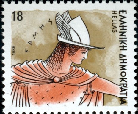 Katalogangabe (Michel): <Ausgabedatum> 17. Februar 1986; <Anlass> Freimarken: Die Götter des Olymp; <Bildinformation> Hermes Hermes, lat. Hermes, Sohn des Zeus und der Maia, auf der Kyllene in Arkadien geboren (daher sein Beiname Kyllenios), der Gott im Steinhaufen, in dem sich ein aufgerichteter Stein oder eine Herme befand; einer der ältesten und vielseitigsten Götter. Als Gott der Herden förderte er das Wachstum der Tiere, er wurde deshalb oft mit einem Widder auf den Schultern dargestellt (Kriophoros, zum Symbol des Guten Hirten geworden). Da die Steinhaufen zur Wegmarkierung verwendet wurden, war