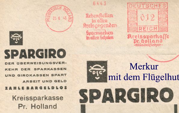 Unter dem Flügelhut bilden die Buchstaben DSGV (wohl: Deutscher Spar-Giro Verband) das Gesicht des Hermes/Merkur.