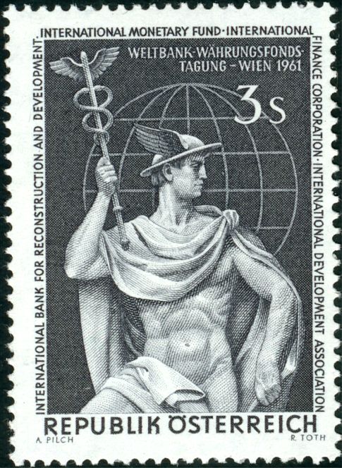 Katalogangabe (Michel): <Ausgabedatum> 18. September 1961; <Anlass> Weltbankkongress, Wien; <Bildinformation> Merkur vor Weltkugel Flügelhut und Caduceus weisen die Männergestalt als Hermes/Merkur aus, hier als Schutzpatron des Bankenwesens. |