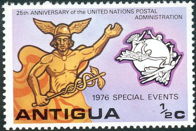 Hermes, von der Bildgestaltung her eher im Wikingerbereich angesiedelt. Rechts das Emblem des Weltpostvereins.