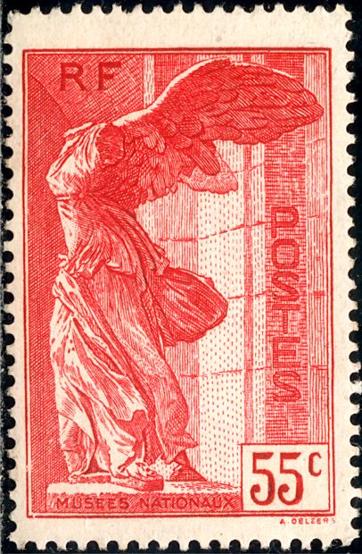 Katalogangabe (Michel): <Ausgabedatum> August 1937 <ohne Datum!>; <Anlass> National-Museen; <Bildinformation> Siegesgöttin von Samothrake, Marmorstatue um 190 v. Chr.; Louvre, Paris