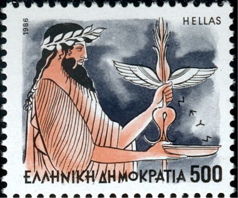 Katalogangabe (Michel): <Ausgabedatum> 17. Februar 1986; <Anlass> Freimarken: Die Götter des Olymp; <Bildinformation> Zeus Das Gebilde, das Zeus in seiner Linken hält, dürfte wohl ein Blitzbündel sein. |